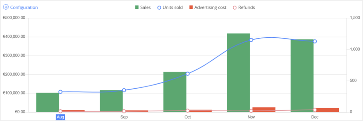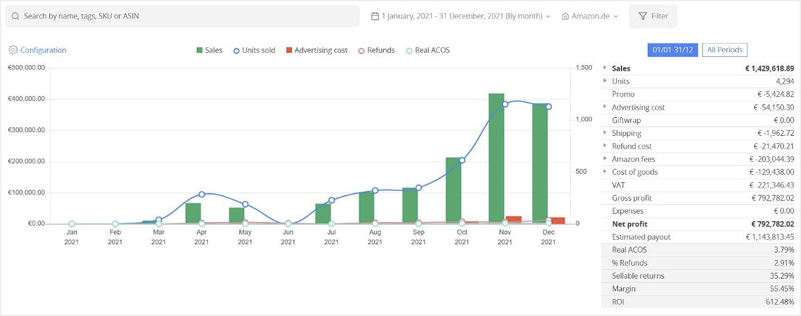 Their hero product showed clear potential, but the account lacked strategic structure, both in A+ content and PPC. After our initial audit and a few consultations, they took action and quickly saw results, growing from €102K in August to €418K in November, finishing the year with €1.4M in total sales. The last 2 months of year have accumulated €804k of sales, which accounts for 56,3% of all their annual revenue.