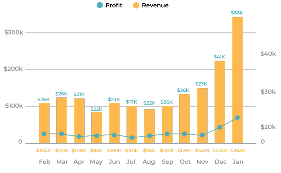 But our new product’s success didn’t stand alone – it had a ripple effect across the entire account. Next January became our best-performing month, with over $360,000 in total revenue: